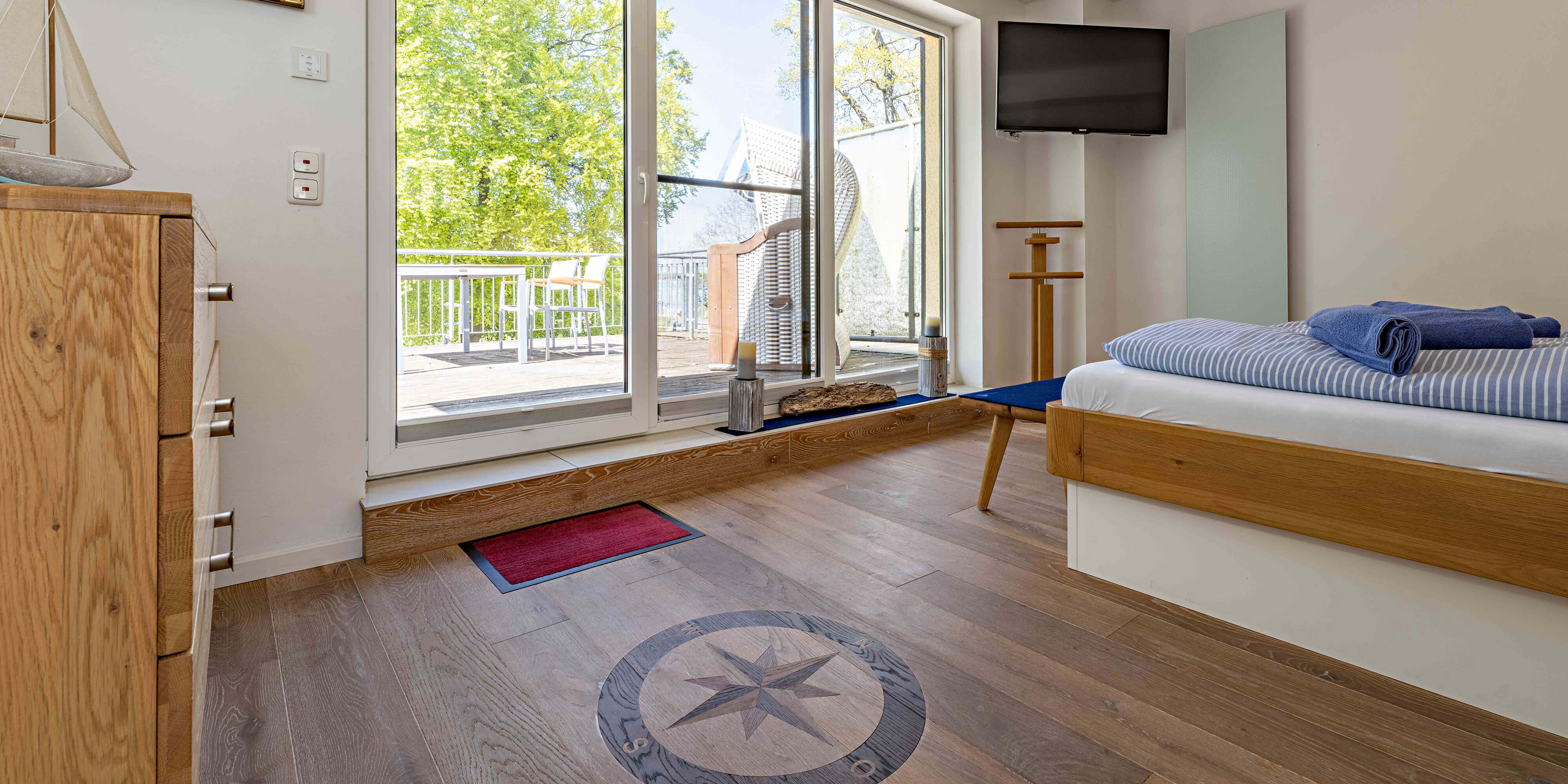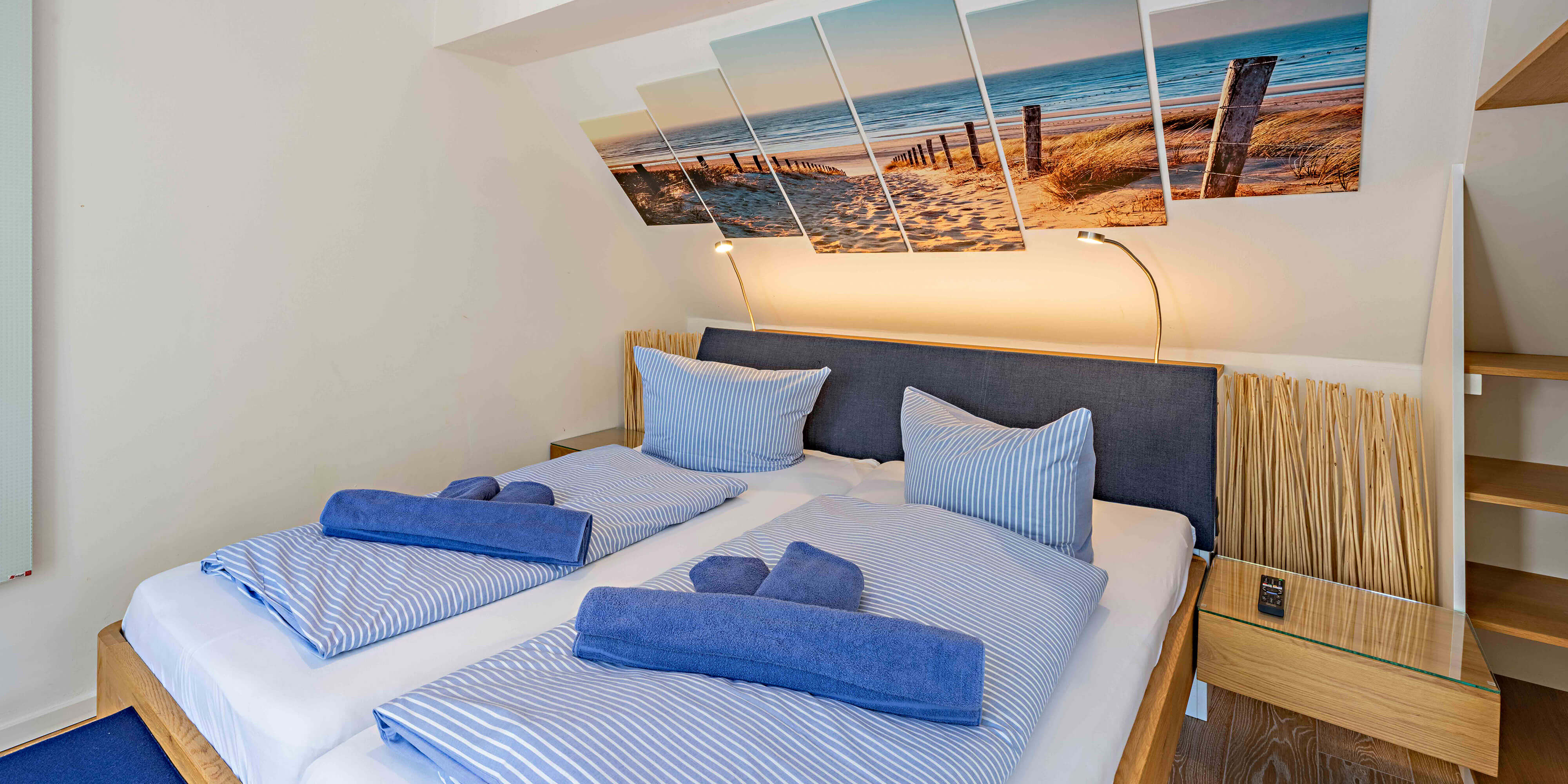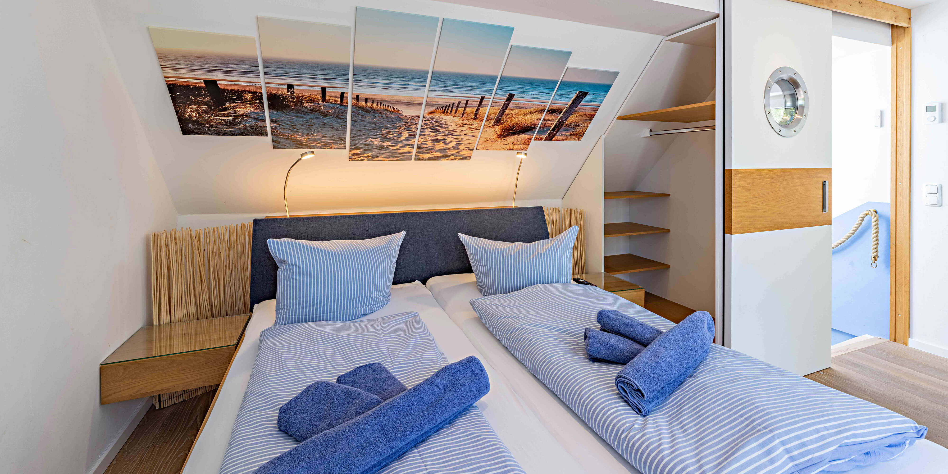 Obergeschoss: Ein Schlafzimmer mit Doppelbett (180x200 cm) und Zugang zur 20 m² großen Dachterrasse mit Strandkorb und Meerblick.